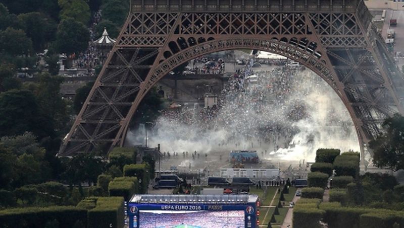 Incidentele din zona Turnului Eiffel au izbucnit după ce suporterii au încercat să intre în fan-zone, închis începând cu ora locală 19,00, după ce s-a umplut până la refuz (peste 90.000 de fani).