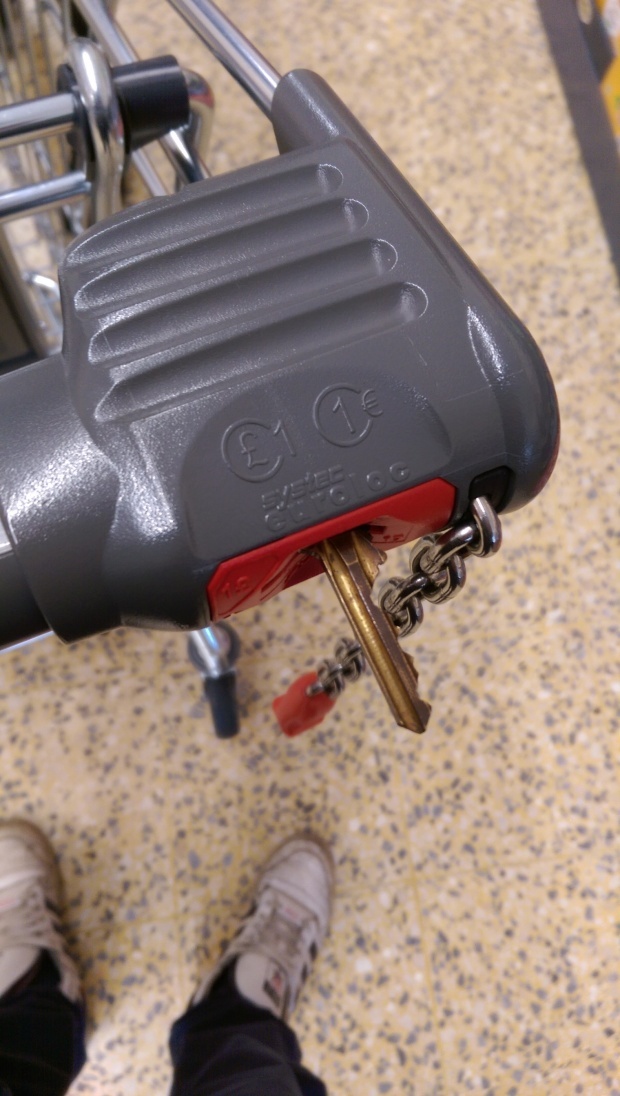 Partea se introduce in carucior exact ca moneda. Iti faci cumparaturile, si apoi returnezi caruciorul, si iti recuperezi cheia. In felul acesta nu mai trebuie sa iti faci griji ca nu ai monede cand mergi la cumparaturi.