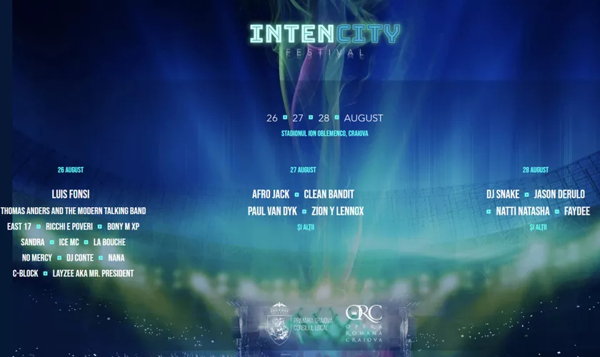 Între 26 și 28 august, Complexul Sportiv Craiova (Stadionul Ion Oblemenco) găzduiește Festivalul IntenCity, evenimentul aflat la prima ediție. Concertul întins pe durata a trei zile va avea pe scenă nume importante din muzica anilor 70-80-90 precum Boney M, Modern Talking, Ricchi e Poveri, Sandra, East 17 sau No Mercy. Alături de ei, fac spectacol artiștii din noua generație: Jason Derulo, Afrojack, Nati Natasha sau DJ de renume internațional.