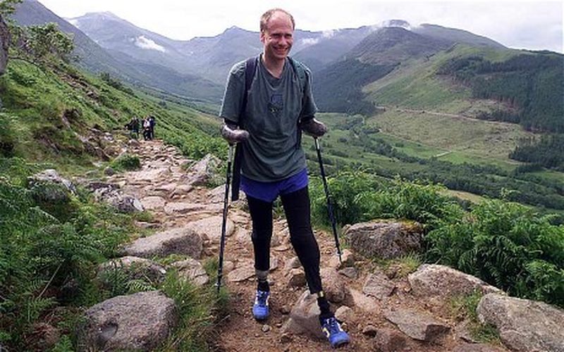 Jamie Andrew a fost nevoit sa invete din nou sa se deplaseze dupa ce si-a pierdut mainile si picioarele, in urma unor degeraturi foarte grave suferite in timpul unui viscol, in Alpii Francezi, la apogeul carierei sale de alpinist, in 1999.