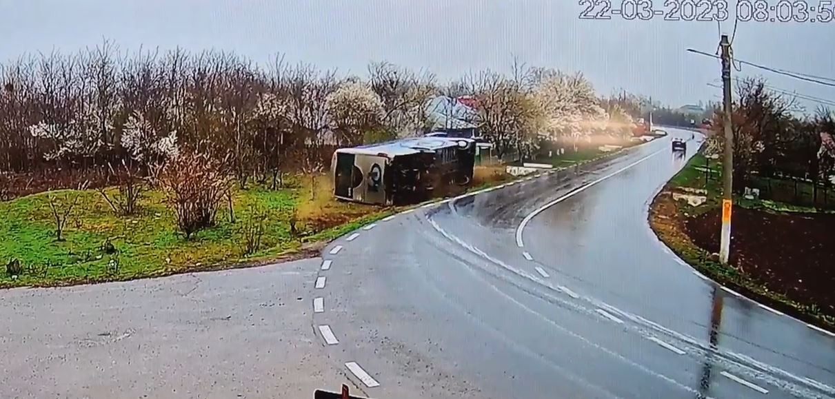 Momentul în care autobuzul s-a răsturnat a fost surpins pe camerele de supraveghere din zonă: