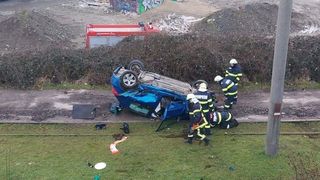Accident în județul Arad, iar o persoană a fost rănită. Un autoturism a căzut de pe pod direct pe liniile de tramvai.