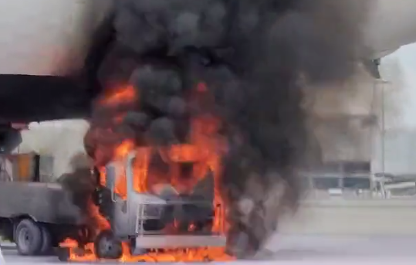Incendierea avionului s-a produs după ce o camioneta de serviciu de la aeroport, aflată sub fuzelajul aeronavei, a luat foc. Flăcările puternice au cuprins imediat avionul, iar fumul negru și des a acoperit întreg aeroportul.