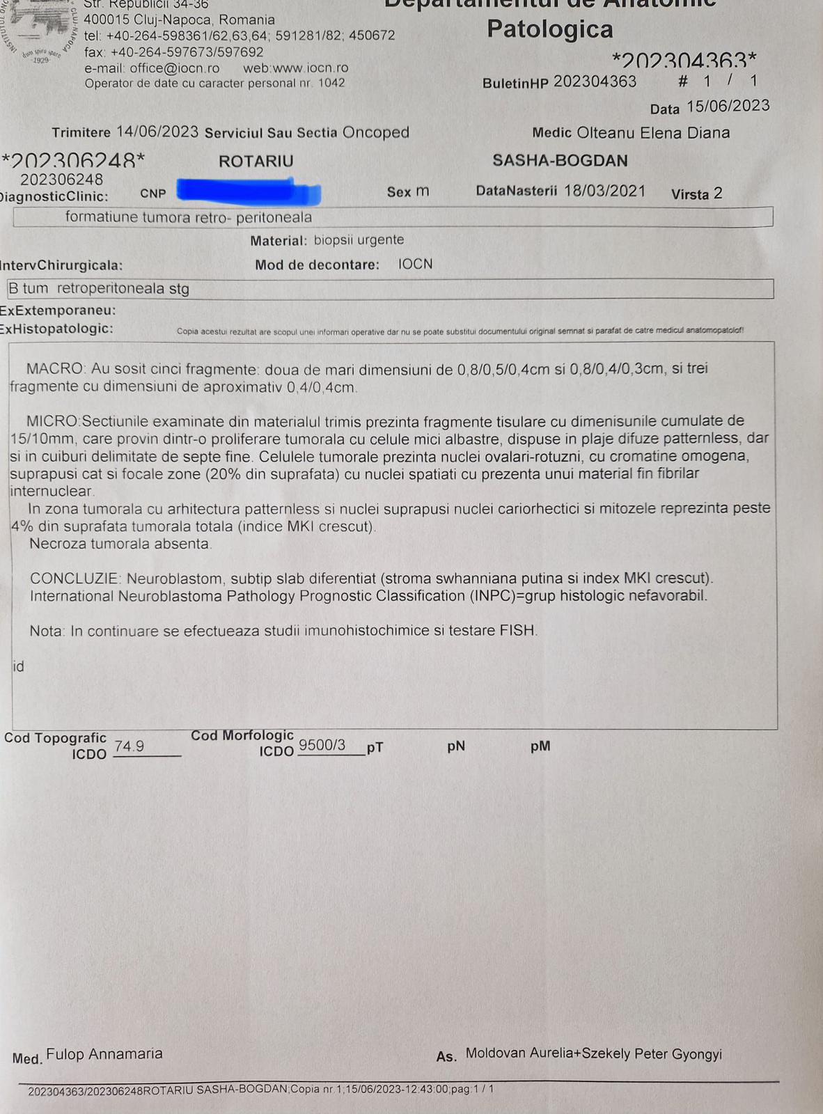 Sasha, un băiețel în vârstă de doar 2 ani, a primit un diagnostic dur. Acesta are o tumoare canceroasă neuroblastom retroperitoneală stângă, de diferite dimensiuni, localizată într-un loc greu accesibil, pe vasele de sânge.