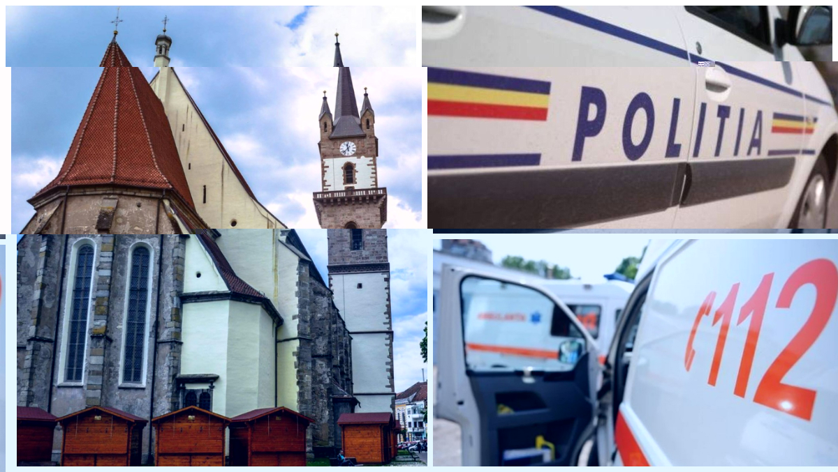 Un bărbat s-a ales cu traumatisme craniene și toracice, după ce a căzut de pe o schelă montată pe Biserica Evanghelică din Bistrița.