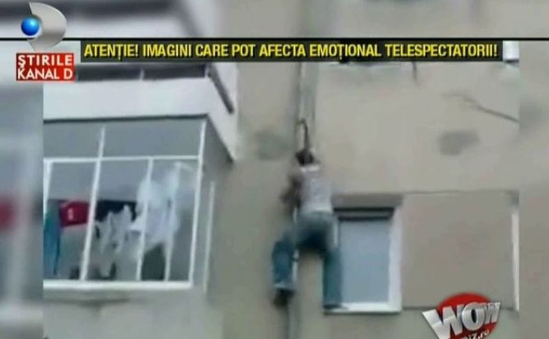1 din 2 | Un barbat a fost filmat cand incerca sa escaladeze un bloc. Trecatorii l-au privit cu sufletul la gura si muti de uimire! Imagini cu un puternic impact emotional!