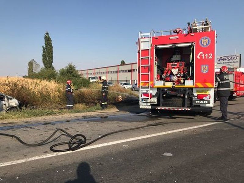 O persoana a fost descoperita carbonizata in masina care a ars. Victima este un barbat de 30 de ani care se pare ca a ramas blocat in autoturismul care a luat foc.