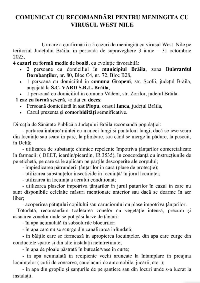 Victima meningitei provocate de virusul West Nile este din din satul Plopu, orașul Ianca, județul Brăila. Bărbatul prezenta comorbidități semnificative, potrivit unui comunicat transmis de DSP Brăila.