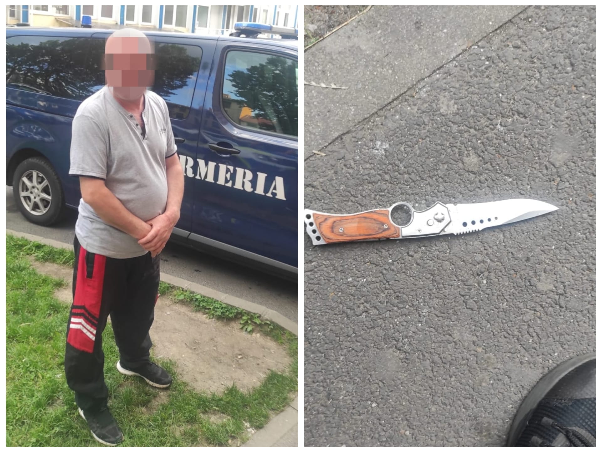 Echipajul de jandarmi solicitat prin apel 112 a ajuns în scurt timp la locul conflictului şi a reuşit imobilizarea bărbatului, precum şi deposedarea de arma albă, reuşind astfel detensionarea stării conflictuale înainte ca aceasta să se soldeze cu