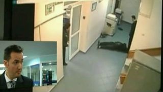 In imaginile surprinse pe camerele de supraveghere se vede clar cum omul, ce vine de dupa un colt, se prabuseste la podea.