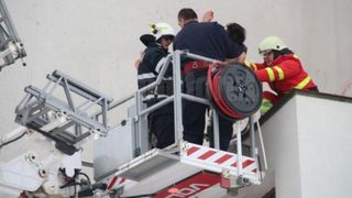 Salvatorii au reusit sa ajunga la el, l-au acoperit cu o patura si l-au coborat cu ajutorul nacelei din dotarea scarii.