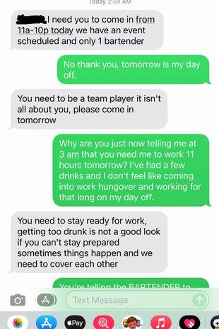 La început, bărbatul a răspuns politicos, reamintindu-i șefului că era ziua lui liberă, așa că nu putea veni. Șeful său s-a înfuriat repede, în timp ce l-a îndemnat să fie un bun coleg de echipă, adăugând: „Nu este vorba doar despre tine”. Bărbatul a răspuns, întrebând: „De ce îmi spui acum la 3 dimineața că ai nevoie să lucrez mâine 11 ore?”