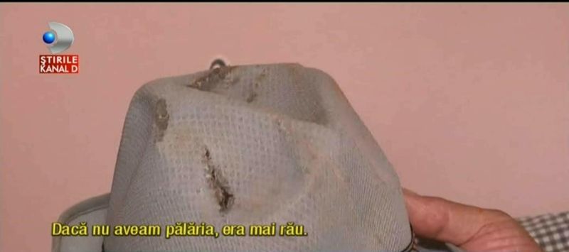Barbatul s-a ales cu capul spart si cu o rana grava la mana stanga,insa este bucuros ca a scapat cu viata.El sustine ca palaria l-a salvat.
