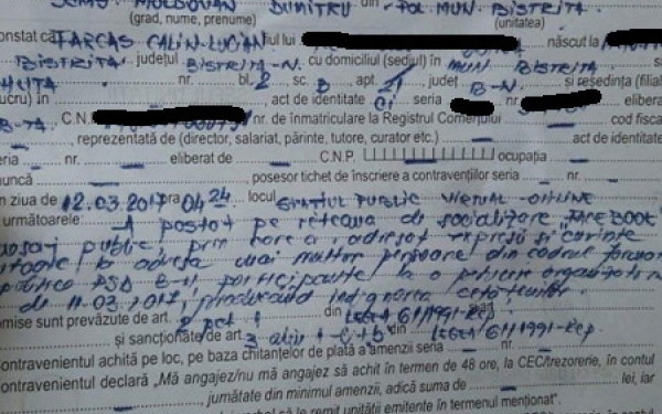 Subcomisarul Moldovan Dumitru este primul politist din Bistrita care a semnat o amenda pentru o fapta petrecuta in mediul online. El l-a amendat pe Calin Lucian Farcas cu suma de 200 de lei pentru ca acesta a postat pe Facebook "un mesaj public prin care a adresat expresii si cuvinte jignitoare la adresa mai multor persoane din cadrul formatiunii politice PSD BN participante la o petrecere organizata in data de 11.03.2017, producand astfel indignarea cetatenilor.", dupa cum scrie in procesul verbal.
