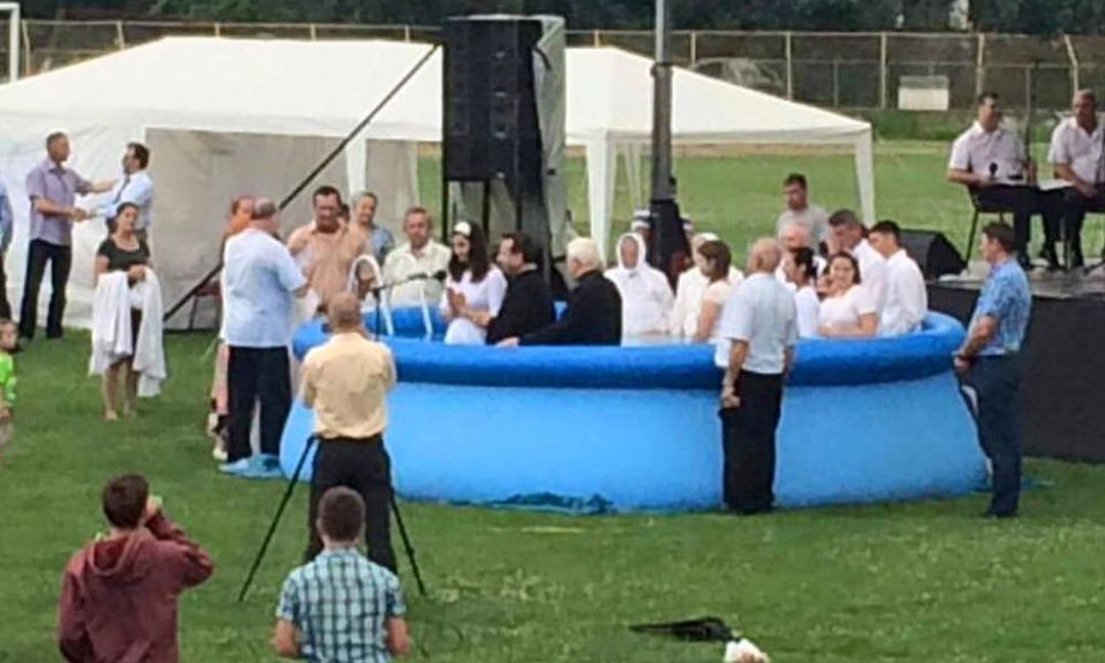 2 din 4 | Un botez evanghelic a avut loc intr-o piscina montata pe stadionul din Lugoj!