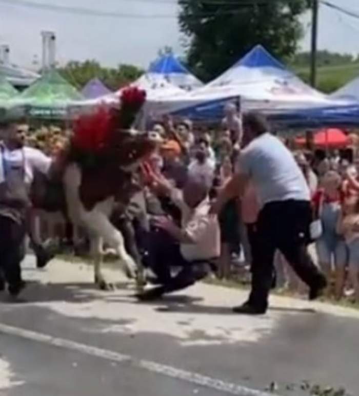 Dintr-o dată, un bou a scăpat de sub control și a luat-o la goană prin mulțime, apoi a trântit la pământ un bărbat, potrivit Antena3.ro.