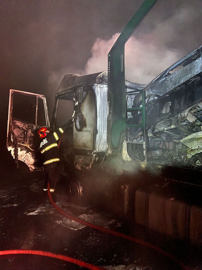 Incendiul ar fi pornit de la una dintre roțile camionului, spun pompierii.