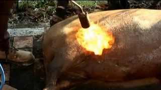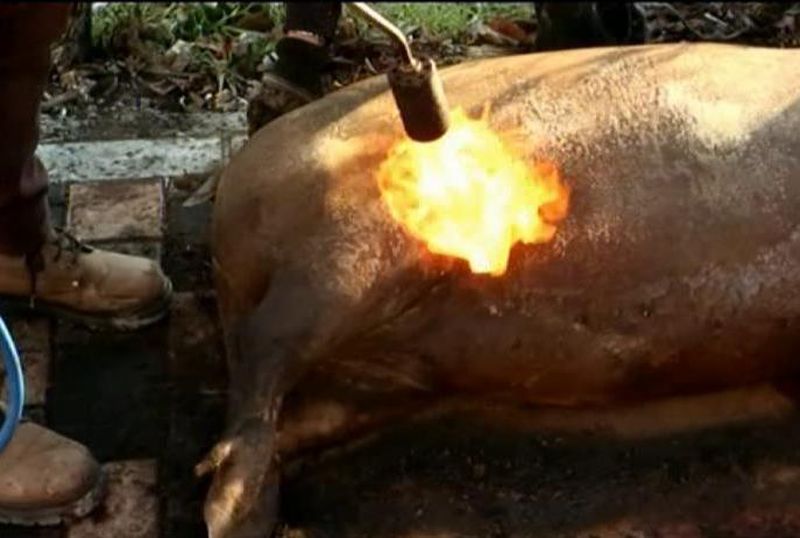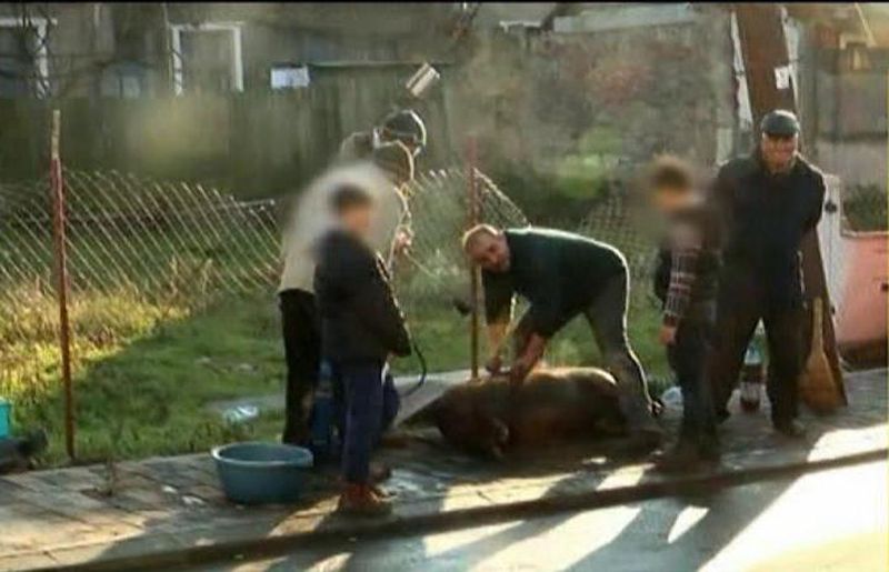 Traditia e aceeasi pentru toti, dar socheaza cand nu tine cont de legi: in mintea gospodarilor de la oras, nu-i nimic in neregula in a-ti sacrifica porcul pe unde trec masini si biciclete. La spectacolul blamat de trecatori, asista si copii!
