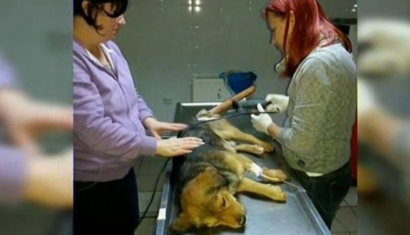 Urland de durere, catelul s-a adapostit sub o masina. Cativa vecini au sunat la o asociatie pentru protectia animalelor. Oamenii cu suflet l-a dus de urgenta la veterinar.