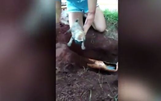 Imaginile au fost surprinse chiar in momentul in care salvatorii au reusit sa il scoata pe catelus din conducta de apa.