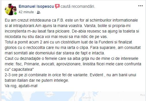 Emanuel Isopescu a făcut un anunț disperat pe care l-a distribuit amicilor săi. „Eu am crezut intotdeauna ca F.B. este un for al schimburilor informationale si al intrajutorarii. Am ajuns la mana voastra. Varsta, bolile si propria-mi inconștienta m-au lasat fara picioare.”, a scris Isopescu.( vezi cum arăta Isopescu în tinerețe)
