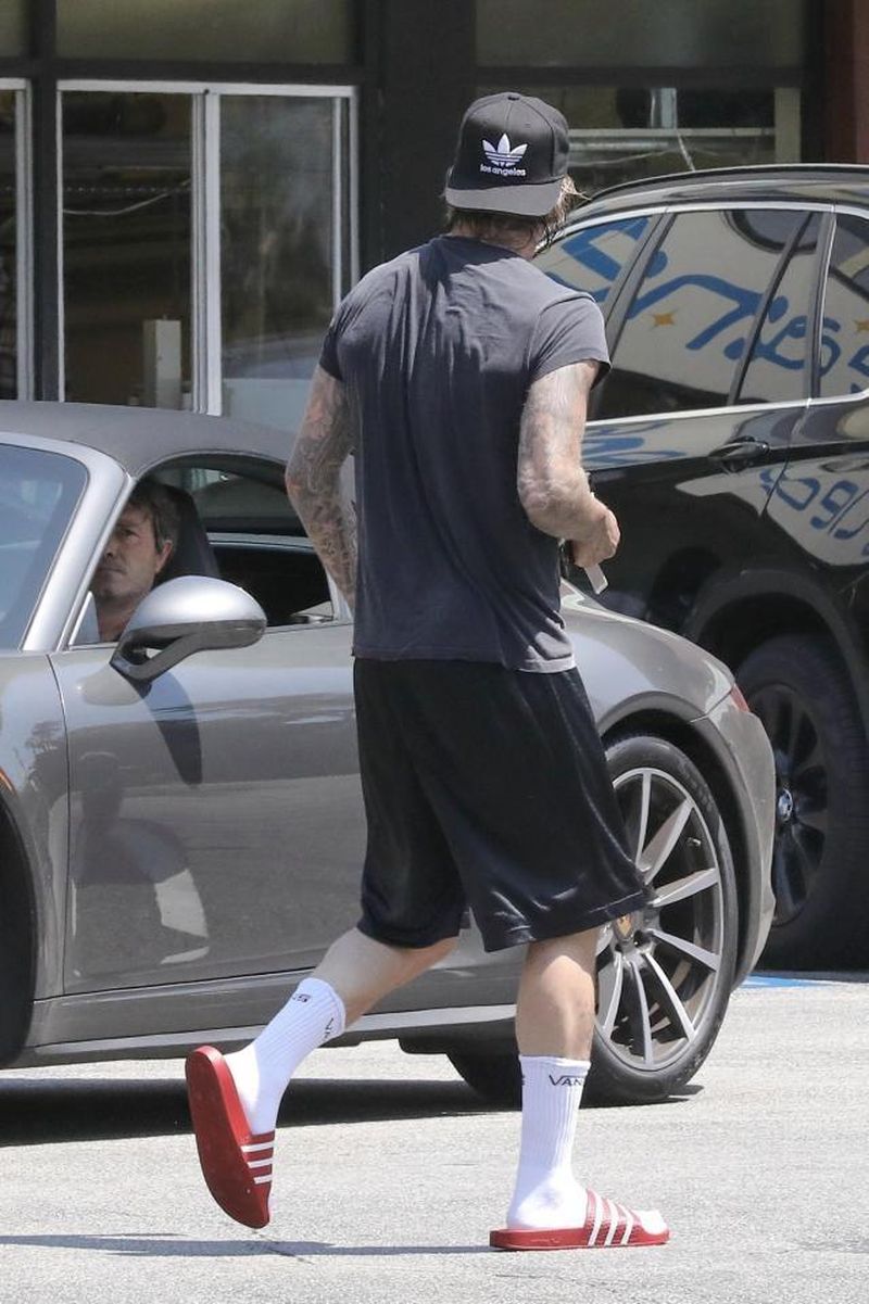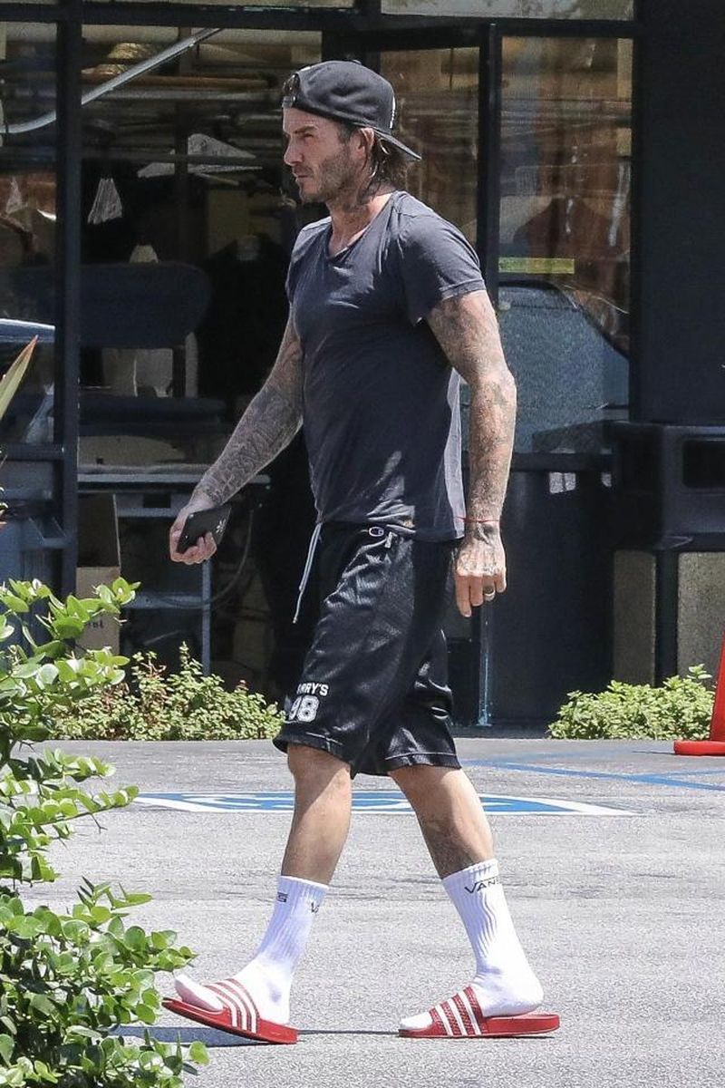 Fostul mijlocas al nationalei Angliei va intra in pamant de rusine cand va vedea ca aceste imagini au ajuns in presa. Beckham a fost fotografiat la Hollywood in timp ce mergea pe strada avand o costumatie bizara. Daca in ceea ce priveste tricoul si sortul, n-ar fi o problema, in partea inferioara, David a comis-o grav de tot. Englezul a optat pentru o pereche de soseste pentru sport si niste slapi rosii.