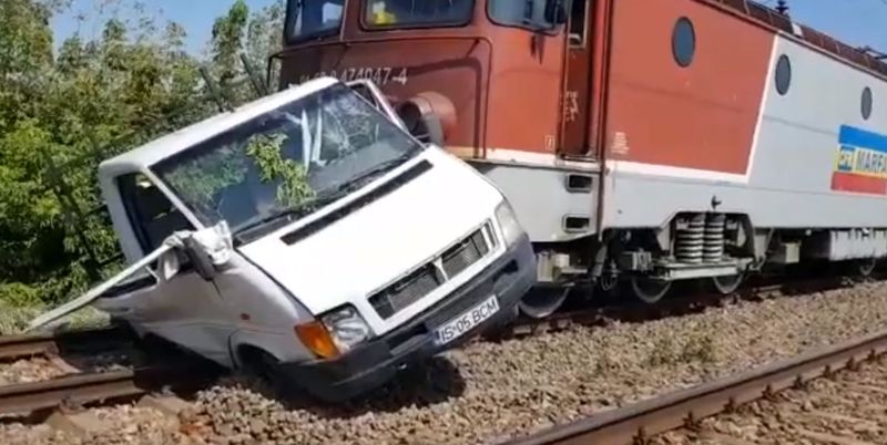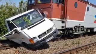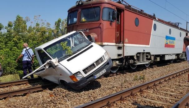 Autoutilitara a fost lovită de un tren marfar şi a fost târâtă pe o distanţă de câteva sute de metri.