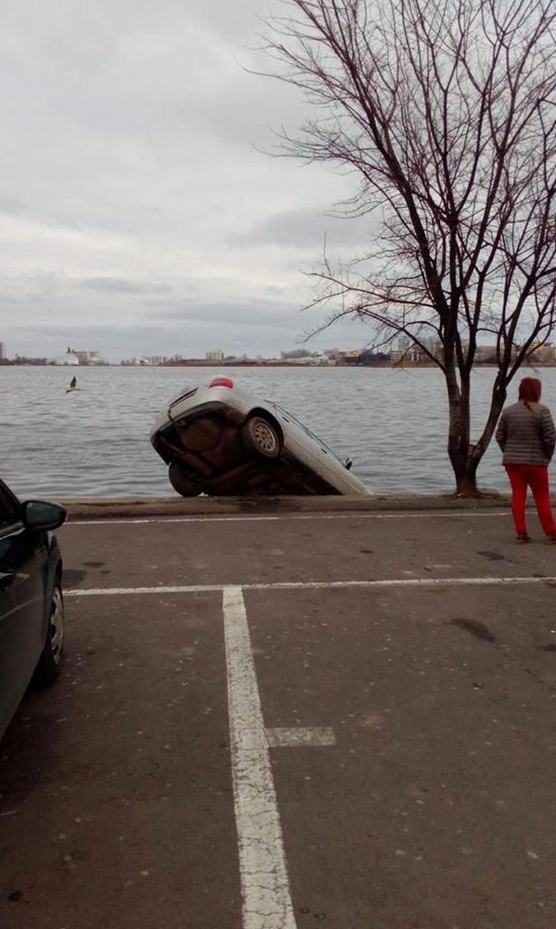 A ajuns cu mașina în lacul Tăbăcăriei. Un șofer neatent a oferit imaginea zilei trecătorilor din Constanța.