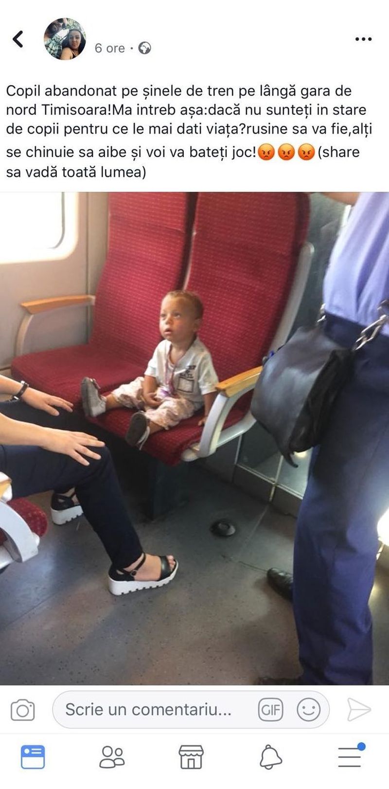 Cea care a facut postarea a dezvaluit ca micutul a fost abandonat pe sinele de tren de la Gara de Nord Timisoara si de atunci umbla buimacit prin trenuri. "Copil abandonat pe sinele de tren pe langa Gara de Nord Timisoara. Ma intreb asa: daca nu sunteti in stare de copii, pentru ce le mai dati viata? Rusine sa va fie! altii se chinuie sa aiba, iar voi va bateti joc!", a scris internauta la descrierea imaginii.