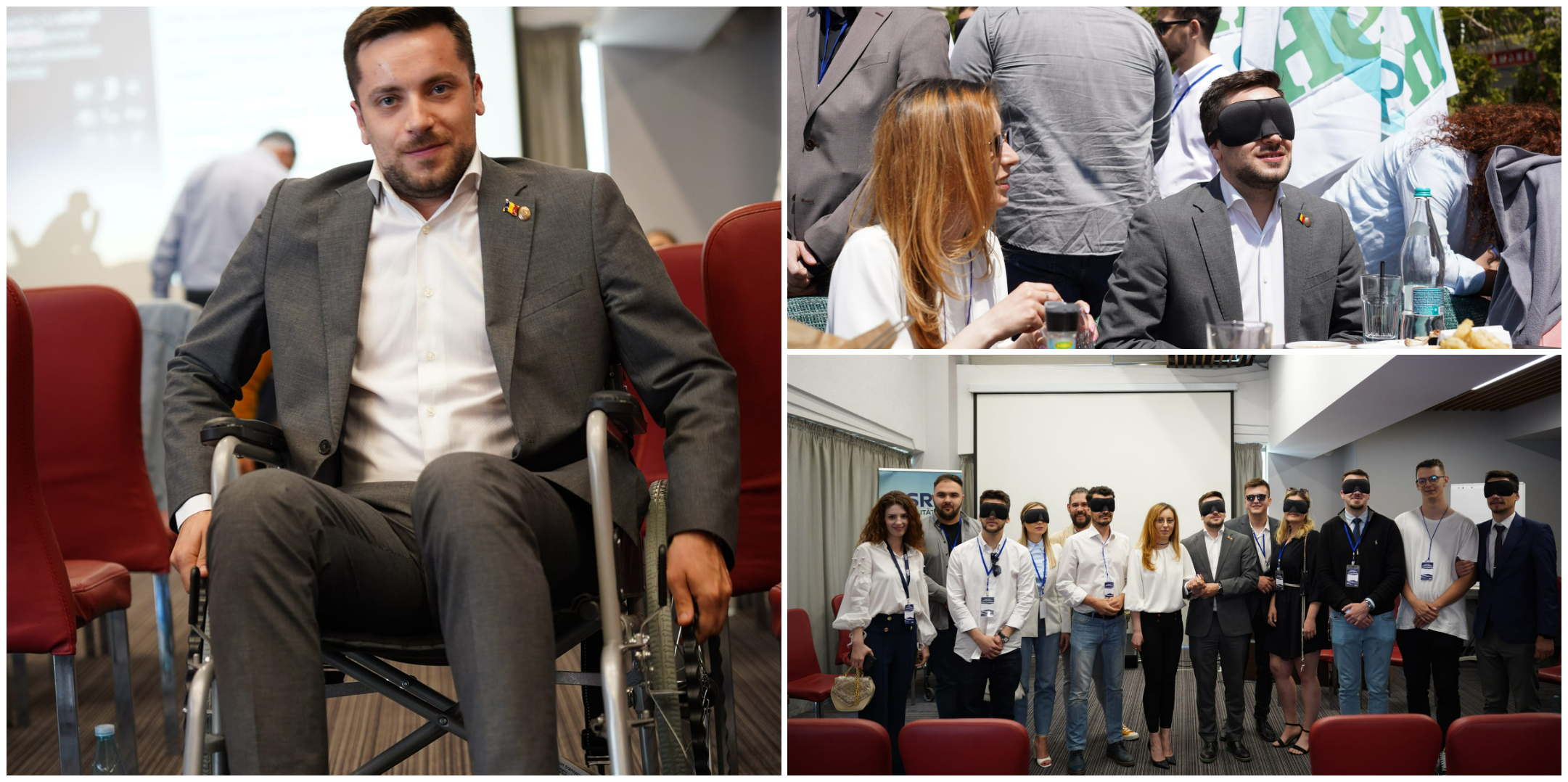1 din 3 | Filip Havârneanu, un deputat USR a participat la un atelier de conștientizare din cadrul Caravanei USR Dizabilități, care l-a transformat într-un om cu diverse deficiențe.