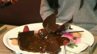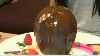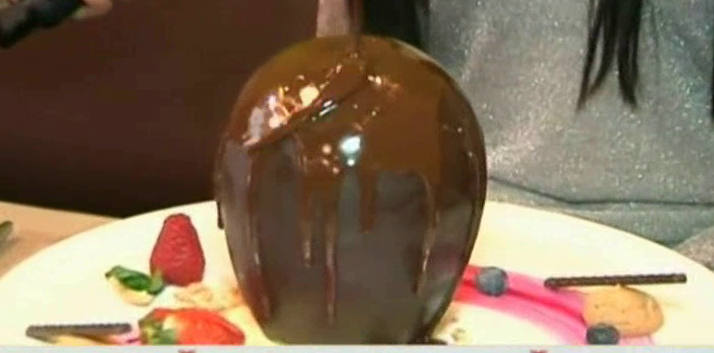 Bolul de ciocolata umplut cu inghetata, turta dulce si fructe de padure se topeste sub picuri incinsi de licoare buna ca mierea.