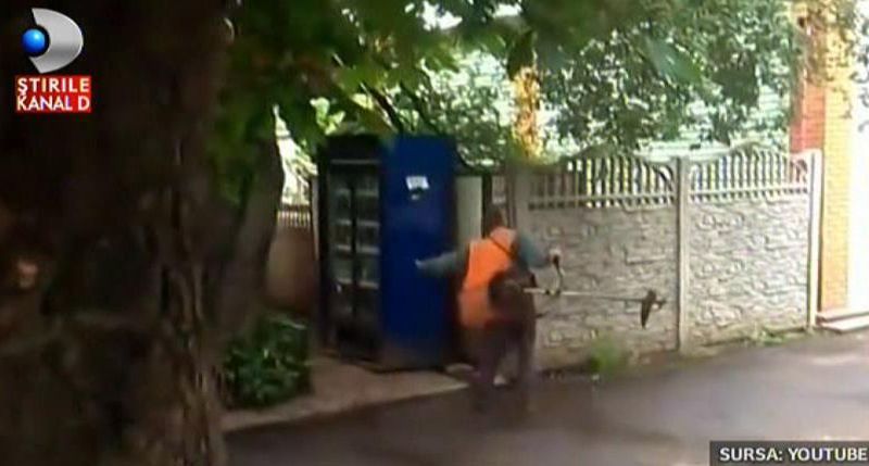 Nici macar o data ce a ajuns la sol, omul nu pare sa constientizeze pericolul la care ii expune si pe ceilalti. Lama ascutita a utilajului se invarte prin aer de jur imprejurul lui, fara ca barbatul sa realizeze ca orice moment ii poate fi fatal.