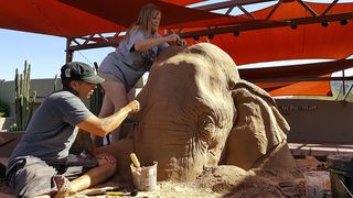 Sculptorii Ray Villefen si Sue Beatrice si-au unit fortele si au realizat o sculpura inedita infatisand un elefant care joaca sah cu un soarece. Creatia este realizata din nisip si a fost executata in marime naturala.