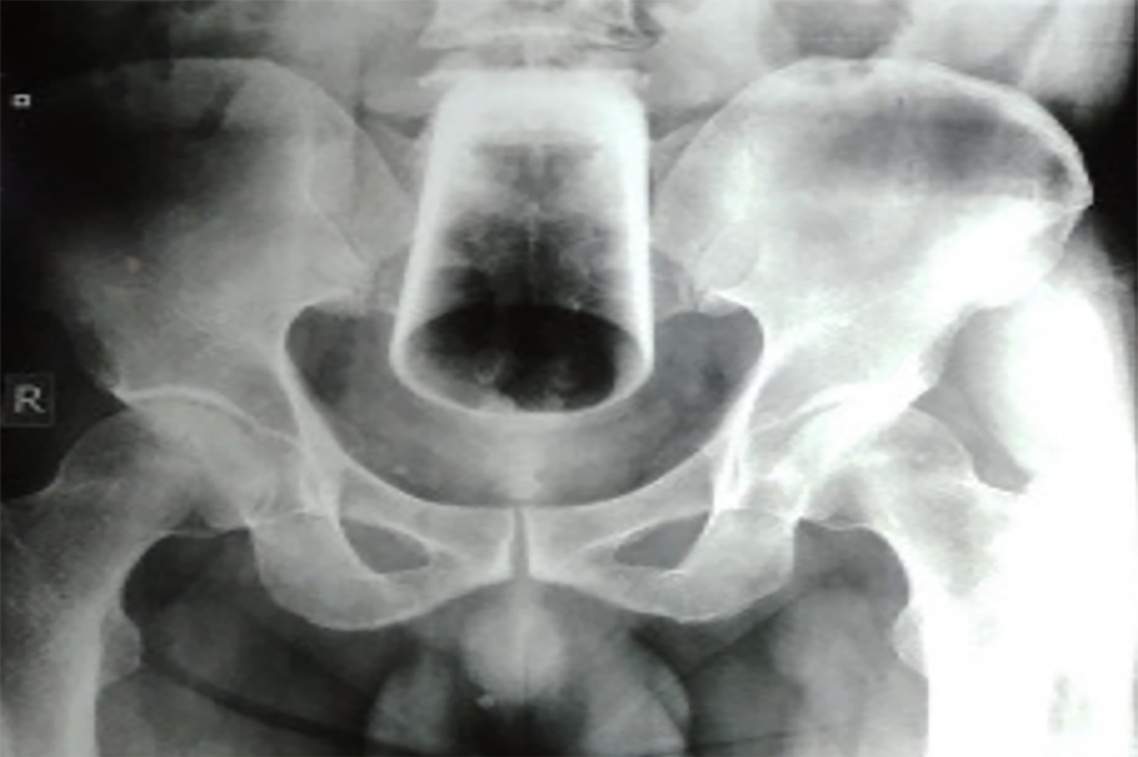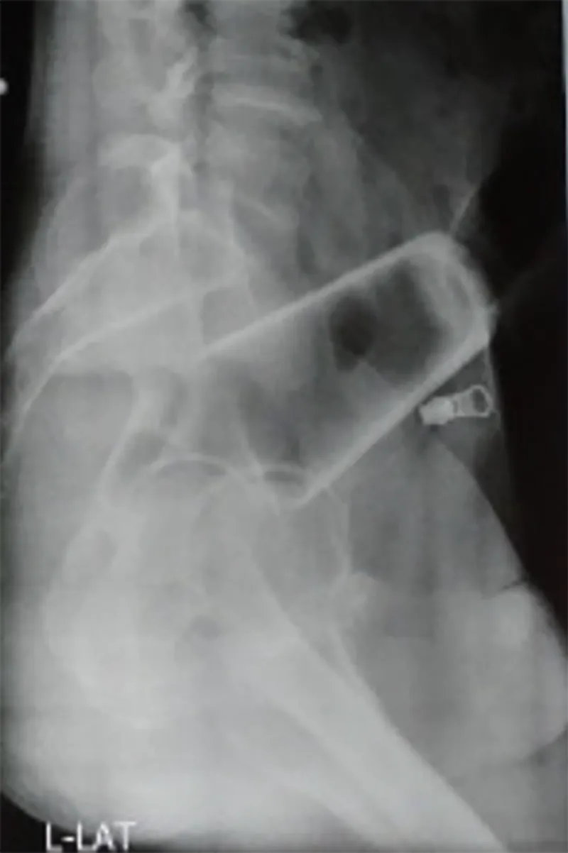 Bărbatul a spus că a încercat să scoată singur sticla, dar nu a reușit. După ce i-au făcut o radiografie, medicii au încercat să îndepărteze paharul fără operație, dar nu au reușit să-l extragă, deoarece era inversat.