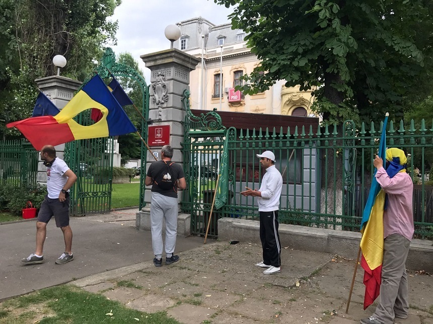 Un grup de cinci protestatari a venit miercuri, in fata sediului central al PSD din Kiseleff, unde se desfasoara sedinta Comitetului Executiv, pentru a scanda impotriva partidului si a lui Liviu Dragnea, unul dintre acestia exprimandu-si increderea ca premierul Sorin Grindeanu va rezista la presiunile presedintelui formatiunii de a demisiona, care ar trebui sa fie "mai insistent".