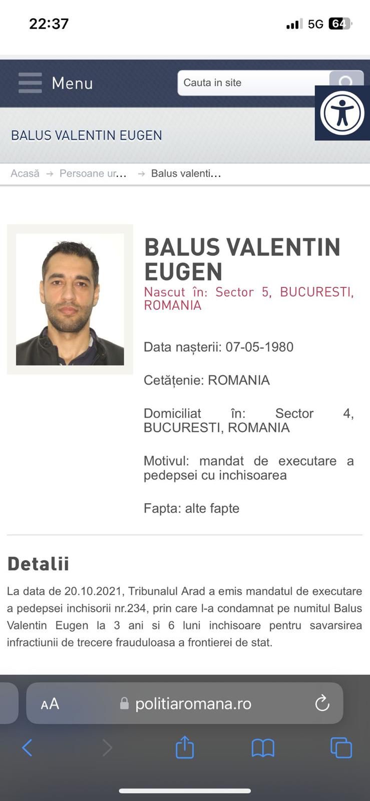 Pe numele acestuia, Tribunalul Arad a emis, la data de 20 octombrie 2021, un mandat de executare a pedepsei cu închisoarea, prin care a fost condamnat la 3 ani și 6 luni de închisoare, pentru trecere frauduloasă a frontierei de stat.