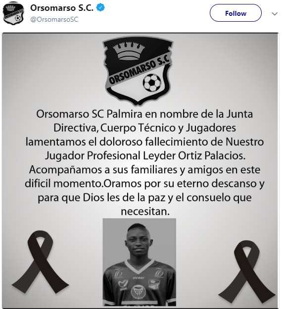 Leyder Ortiz Palacios, component al echipei columbiene Orsomarso SC, a incetat din viata, duminica dimineata, la varsta de 21 de ani, dupa ce a fost injunghiat la o petrecere.