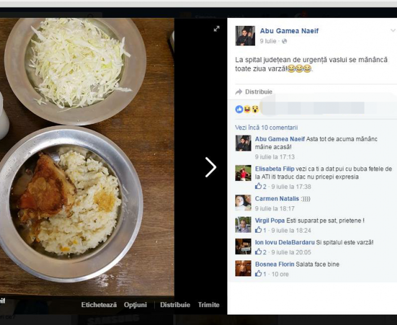 Medicul ORL-ist Abu Gamea Naeif este foarte suparat pe conducerea spitalului din Vaslui, pentru ca mancarea pe care medicii o primesc in timpul garzilor este "varza". Acesta a postat pe o retea de socializare poze cu farfuriile de mancare primite, spunand ca "asa mancare nici cainii nu mananca".