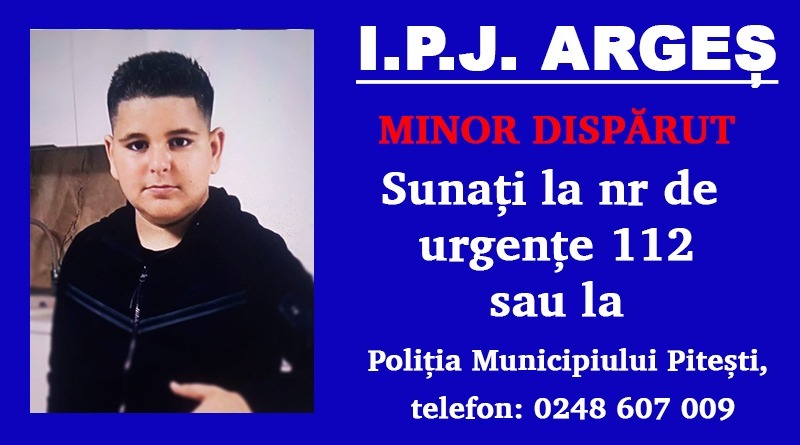 ”Poliţiştii din cadrul Secţiei de Poliţie Rurală Bascov şi poliţiştii din cadrul Poliţiei Municipiului Piteşti desfăşoară cercetări, în urma sesizării referitoare la plecarea voluntară a minorului Cristache Sergio Gabriel, de 13 ani, din Merişani. Acesta ar fi plecat în jurul orei 10:00, în cursul zilei de astăzi, şi nu se află la prima plecare voluntară.