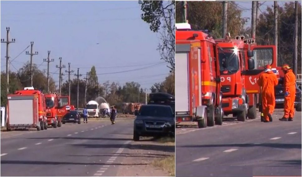 Există din nou riscul unei explozii la locul tragediei de la Crevedia! În aceste momente, pompierii intervin la fața locului şi încearcă să răcească o cisternă cu GPL, pentru că nu se poate face cercetare.