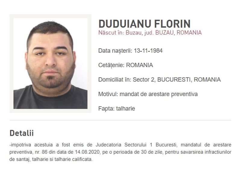 sub supravegherea Parchetului de pe lângă judecătoria Sectorului 1. Față de alte 11 persoane au fost dispuse măsuri preventive în aceeași cauză. La data de 14 august 2020, Judecătoria Sectorului 1 București a emis mandate de arestare preventivă, în lipsă, față de doi bărbați, membri ai unui grup infracțional, pentru săvârșirea infracțiunilor de tâlhărie și șantaj. Cei doi au fost dați în urmărire, fiind demarate demersurile legale pentru solicitarea mandatelor europene de arestare”, a transmis Biroul de Presă al Poliției Române.