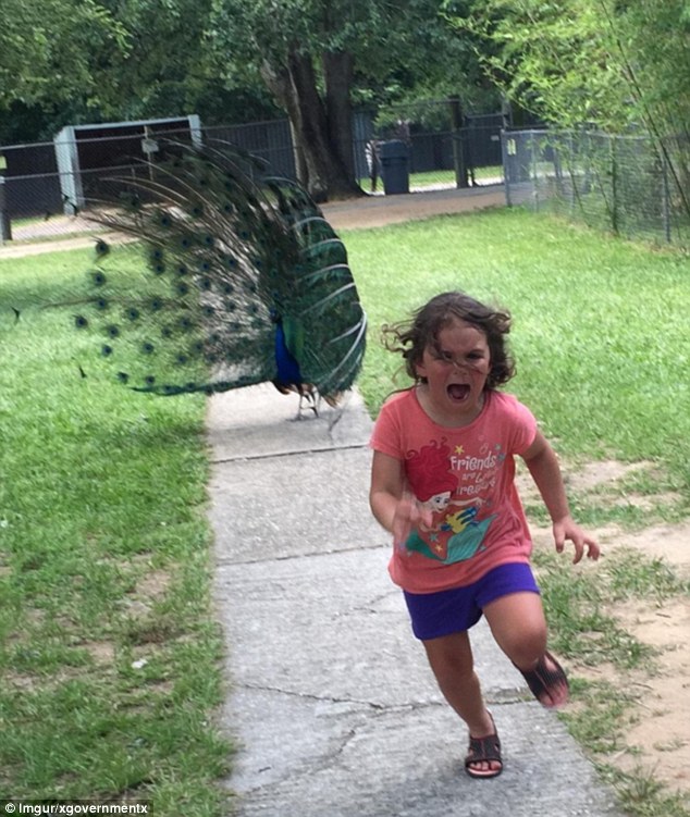 O fetita a devenit un adevarat star pe internet dupa ce a fost fotografiata fugind de un paun. Fotografia cu copila terifiata de pasarea care venea pe urmele ei a facut valva pe retelele de socializare.