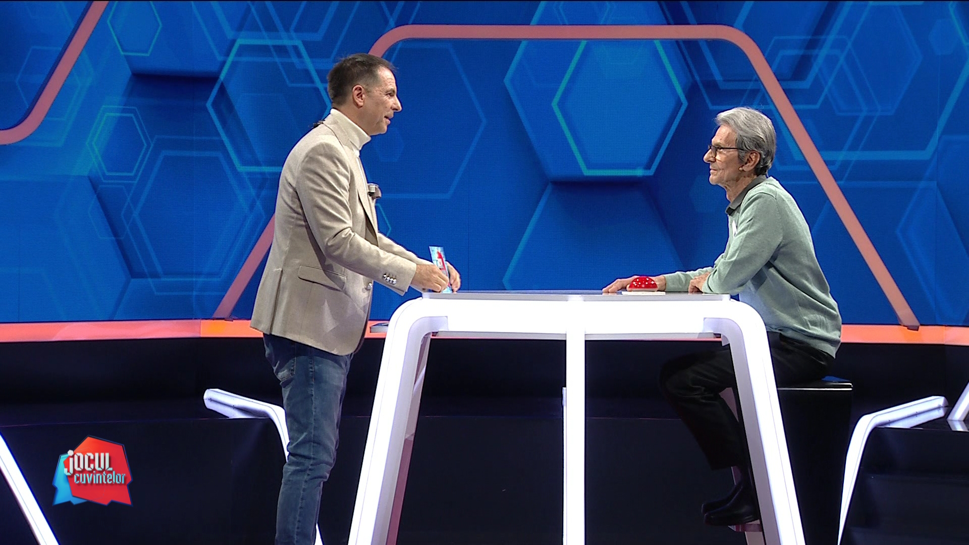 În competiția din această seară, concurentul cu cei mai mulți kilometri de cuvinte rostite de-a lungul vieții este fără dar și poate Mihai Meșteru.