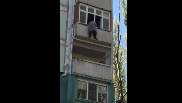 Imaginile socante cum barbatul incerca sa sara de la etaj au fost surprinse de unul dintre locatarii blocului, scrie publika.md.