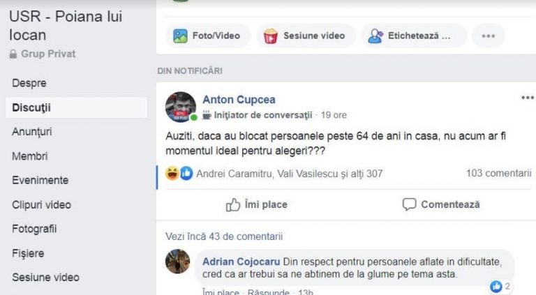 Izolarea persoanelor de peste 65 de ani la domiciliu a intrat în atenția unui politican aflat la începutul carierei. “Un membru USR a postat pe grupul intern de discuții Poiana lui Iocan, după anunțarea măsurilor de carantină aproape totală, un mesaj pentru care a primit un val de critici, dar au fost numeroși alți membri USR care au apreciat comentariul colegului lor și s-au amuzat”, a dezvăluit g4media.ro.