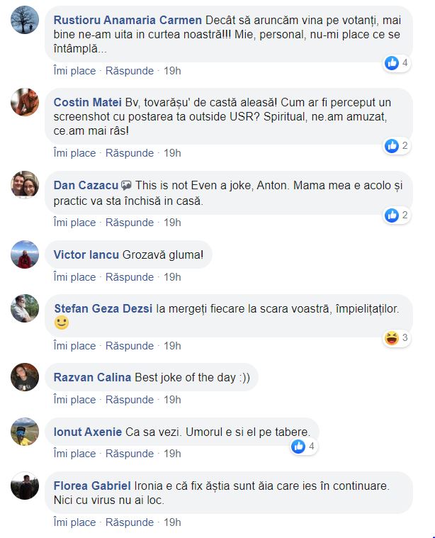 “Este absolut scarbos ce faceti! Absolut! Chiar credeti ca veti dobandi capital politic asa? Ma faceti sa ma gandesc de mai multe ori inainte de a mai vota USR. Rusine! ...Decât să aruncăm vina pe votanți, mai bine ne-am ita în curtea noastră! Nu-mi place ce se întâmplă...Bravo, tovarăsu de castă aleasă! Spiritual, ne-am amuzat, ce am mai râs!”, au scris unii internauți.
