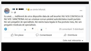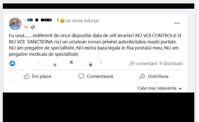 ”Eu unul....... indiferent de orice dispoziție dată de șefii ierarhici NU VOI CONTROLA ȘI NU VOI SANCȚIONA nici un cetățean român privind autenticitatea măștii purtate.