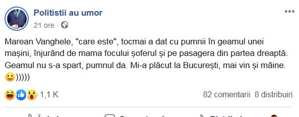 ”Marean Vanghele, "care este", tocmai a dat cu pumnii în geamul unei mașini, înjurând de mama focului șoferul și pe pasagera din partea dreaptă.