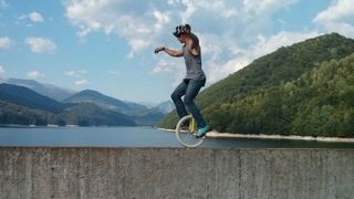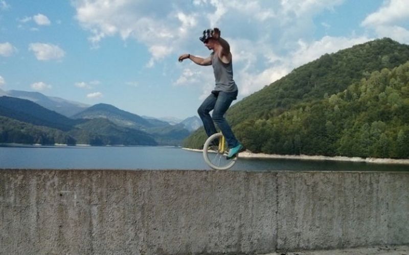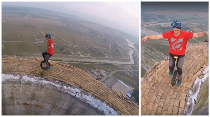 Alături de un prieten, acrobatul român a escaladat un coş de termocentrală de la CET Târgu Jiu înalt de 256 de metri, iar apoi a mers cu un monociclu pe marginea construcţiei. Filmuleţul a fost realizat în luna iulie a acestui an.
