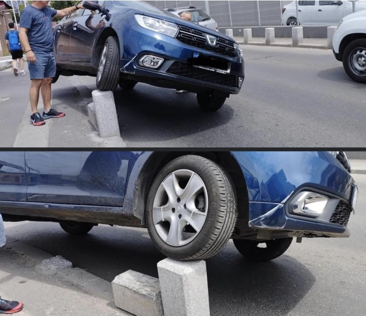 Un șofer a dărâmat un bolard de beton, dar pe al doilea a rămas suspendat.
